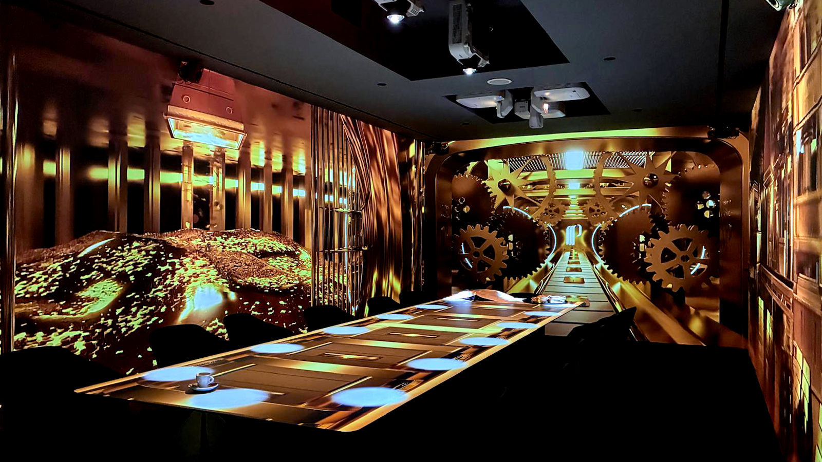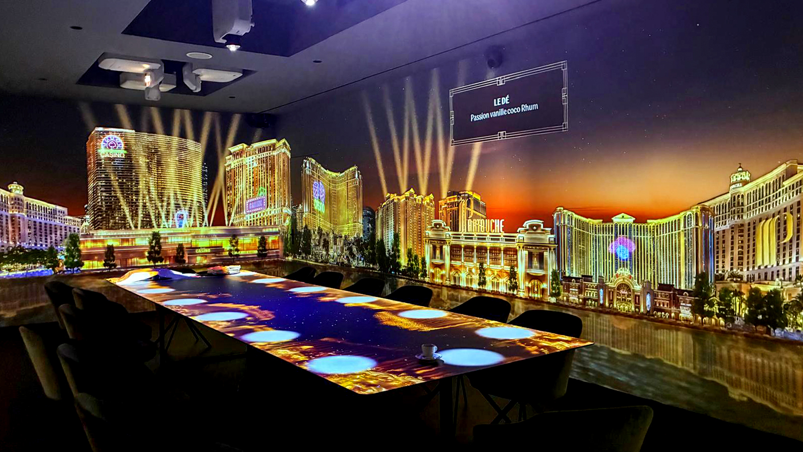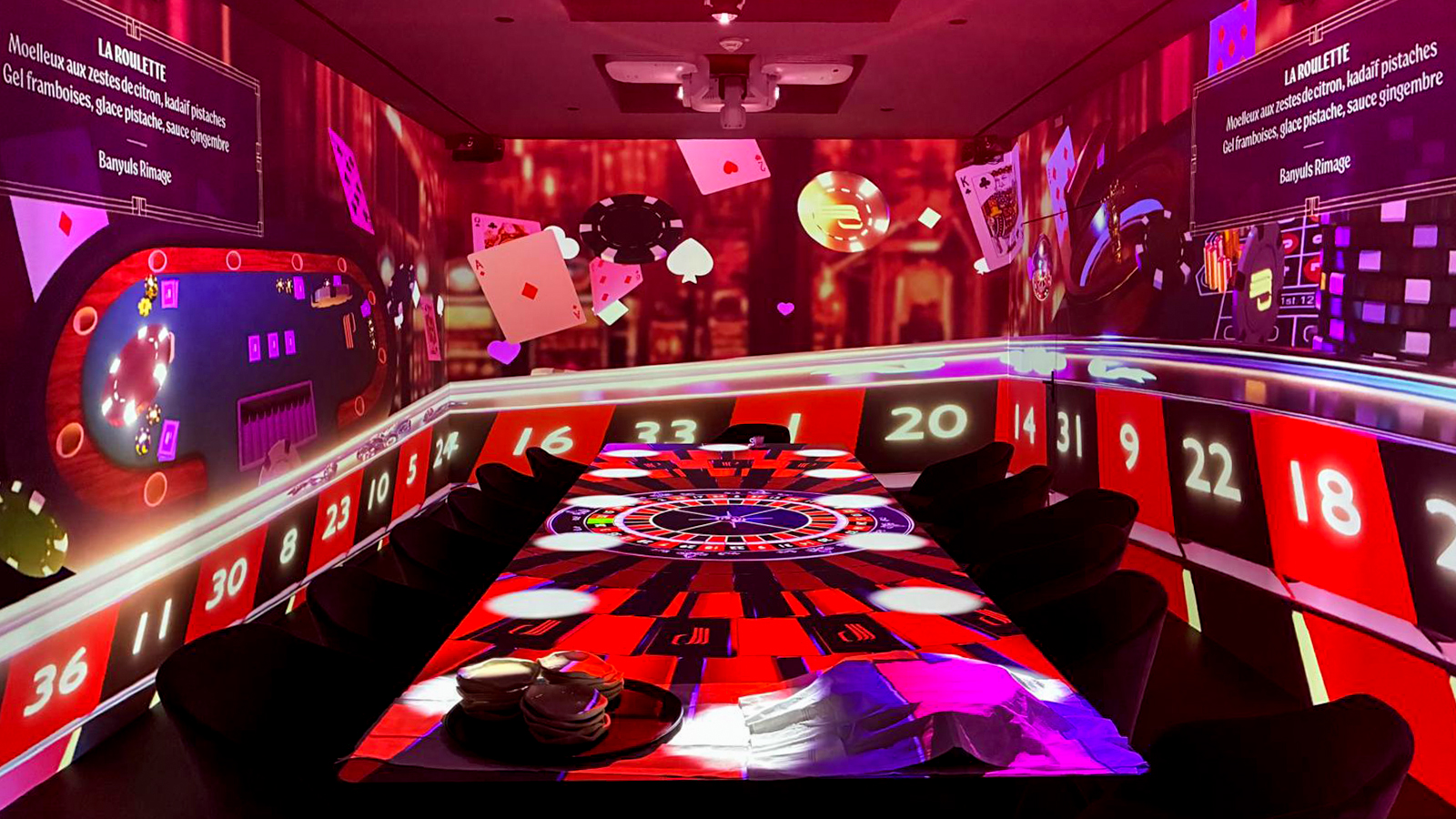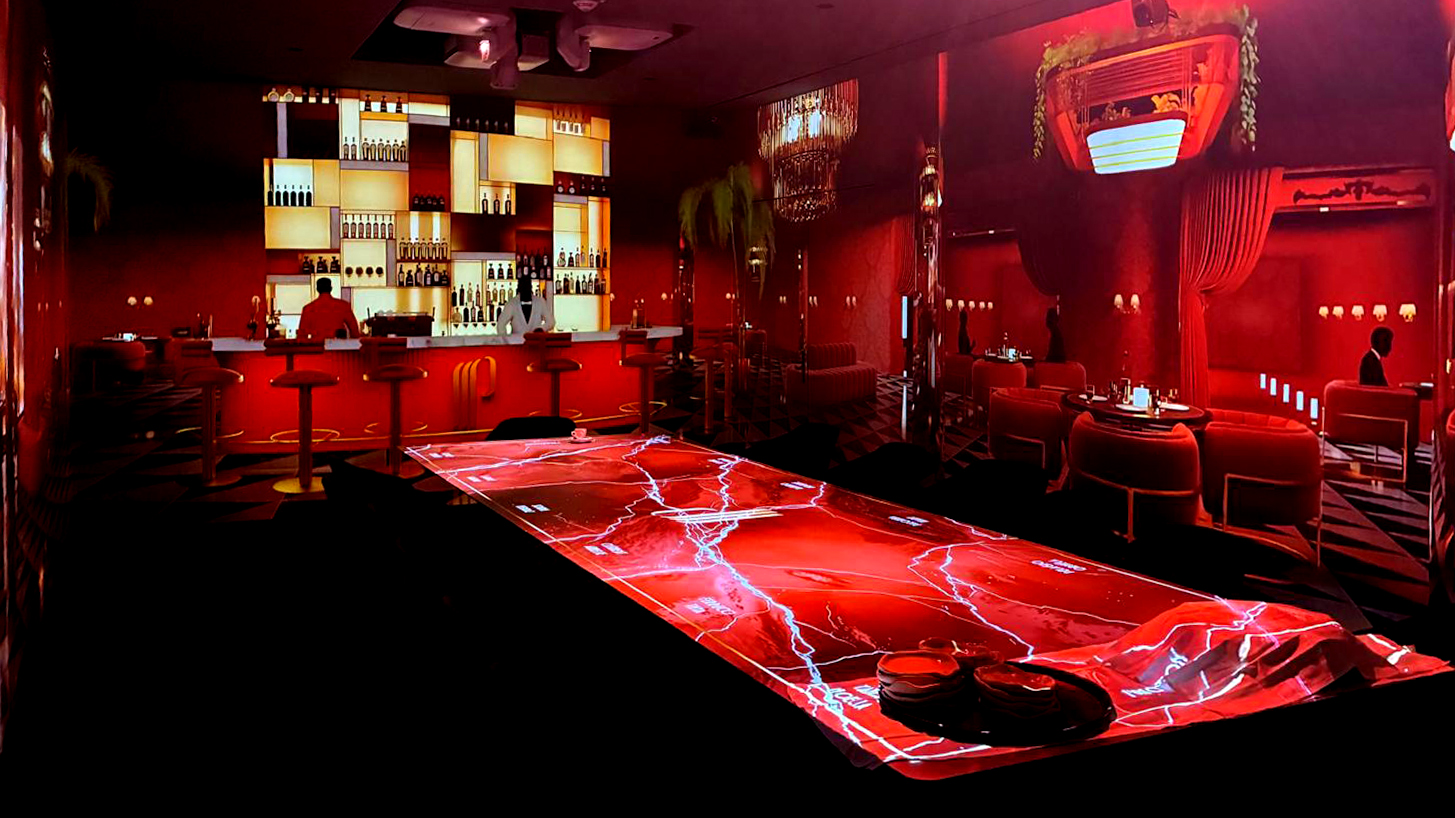 Pensé comme un voyage sensoriel, le lieu mêle projection vidéo, création sonore et scénographie pour faire évoluer l’ambiance tout au long du dîner. Chaque séquence visuelle s’intègre au rythme du service et participe à une expérience globale, où les dimensions visuelles, sonores et gustatives dialoguent.